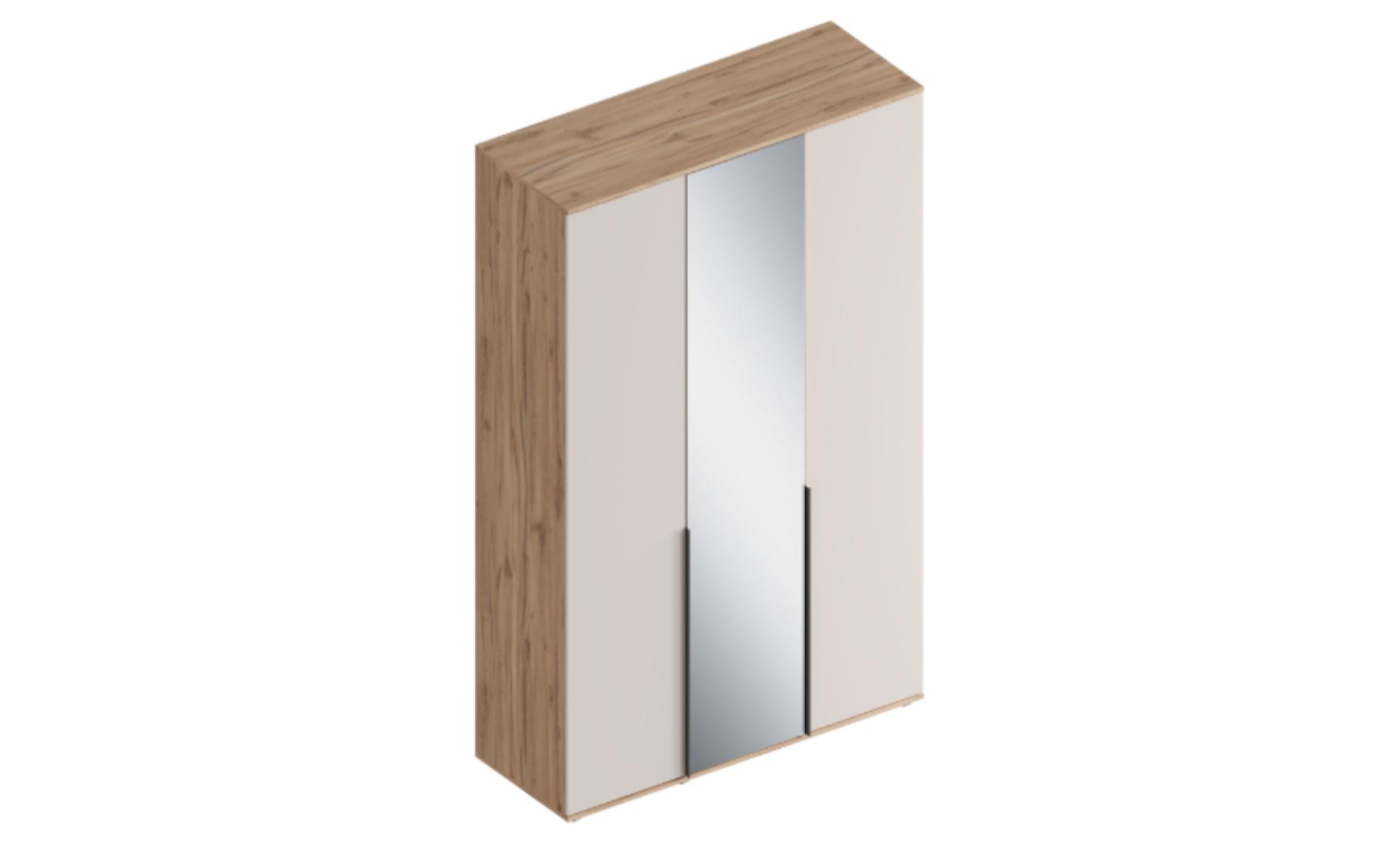 Шкаф с 3-мя распашными дверками. За створками отделения поделены на отсек с штангой и отсек с полками.