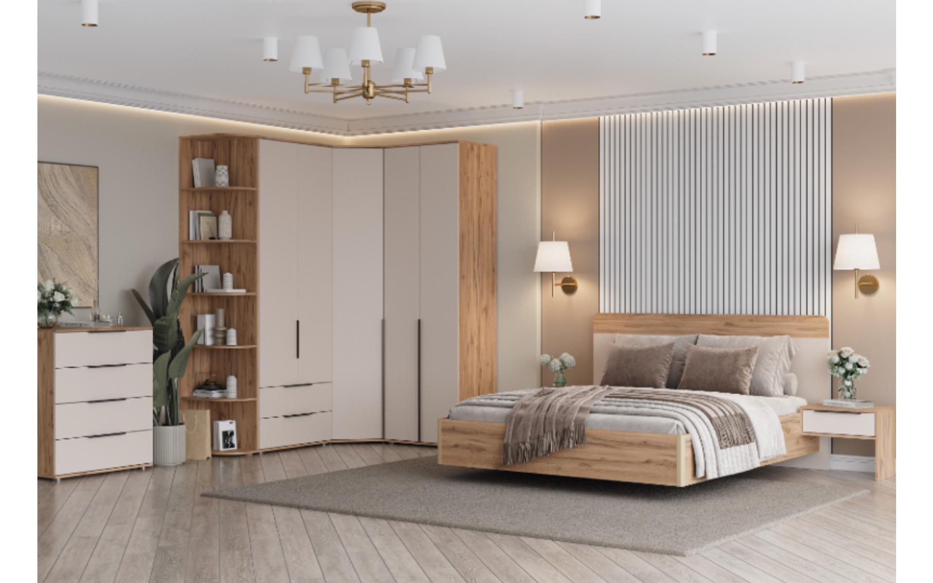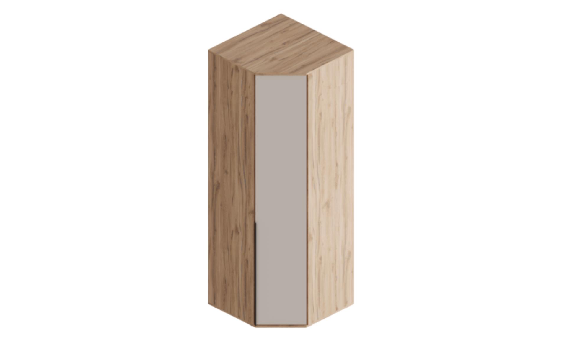 Угловой шкаф с одной распашной дверкой. Наполнение шкафа поделено на отсек с полками и штангой.