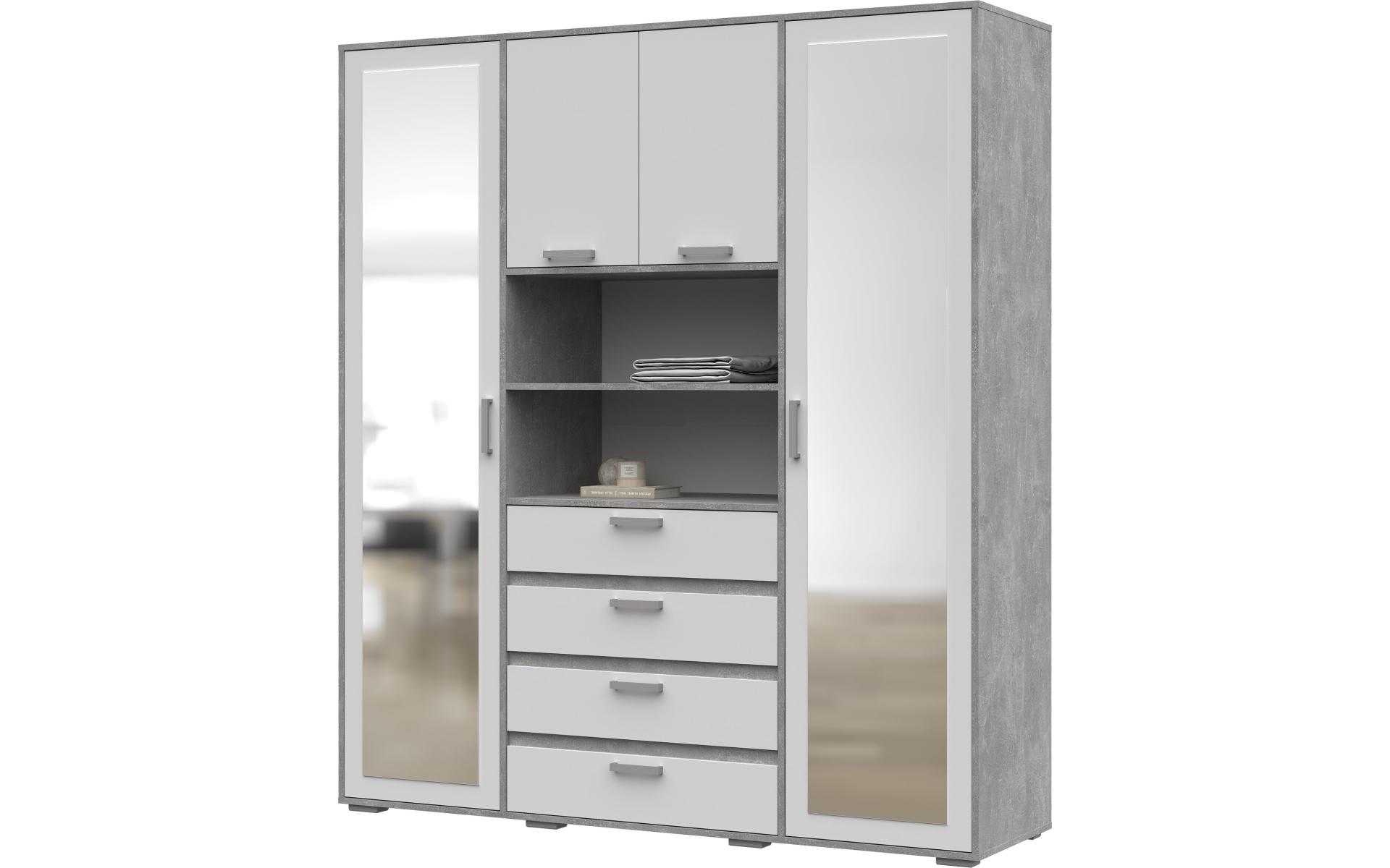 Многофункциональный шкаф с зеркалом, имеет комодную часть с четырьмя выдвижными ящиками, нишу с полками, два пенала (отсека) с штангой и антресольную часть с двумя распашными створками.