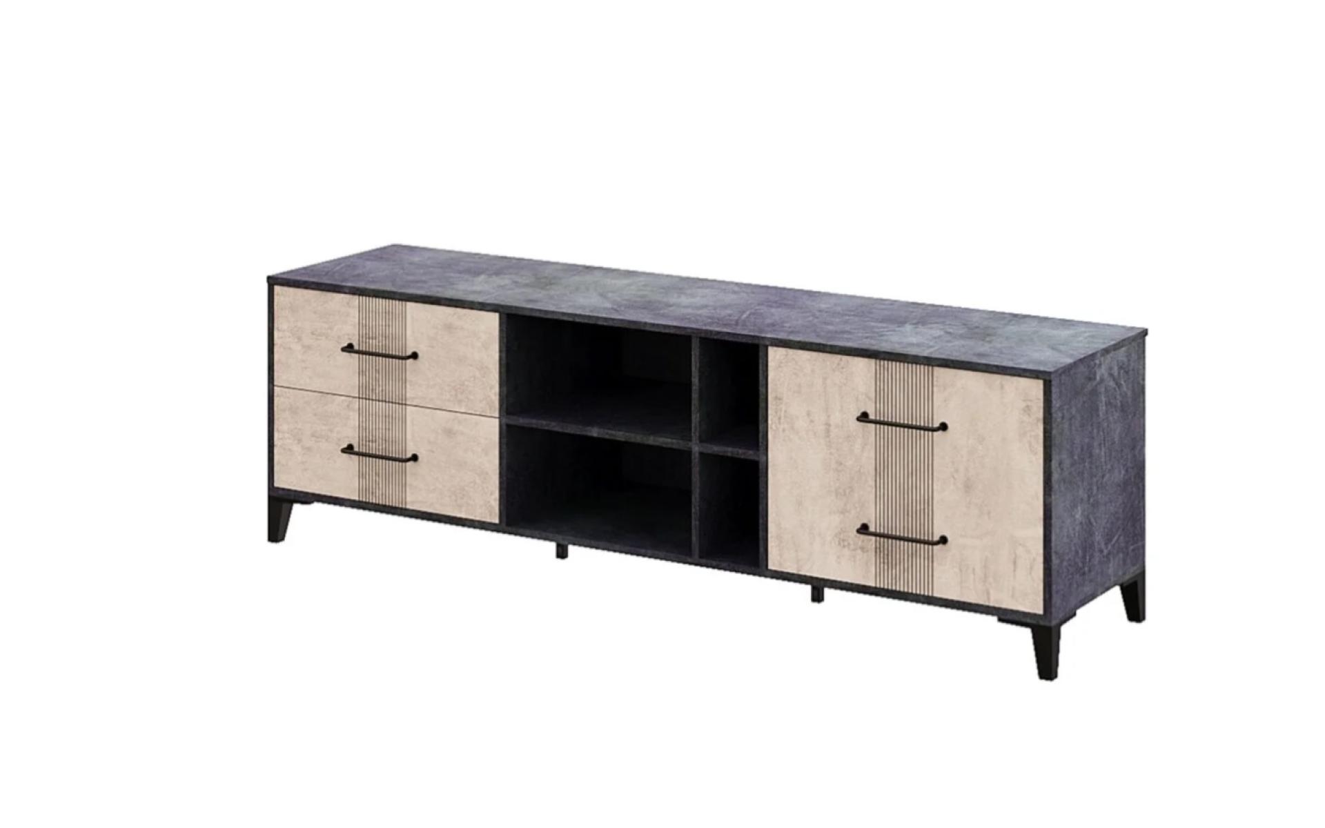 Прямая тумба под ТВ с нишей, двумя выдвижными ящиками и распашной дверкой.