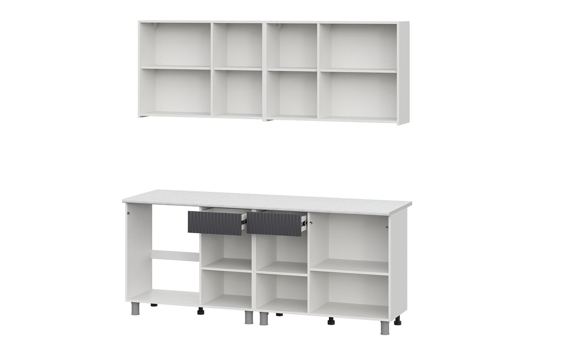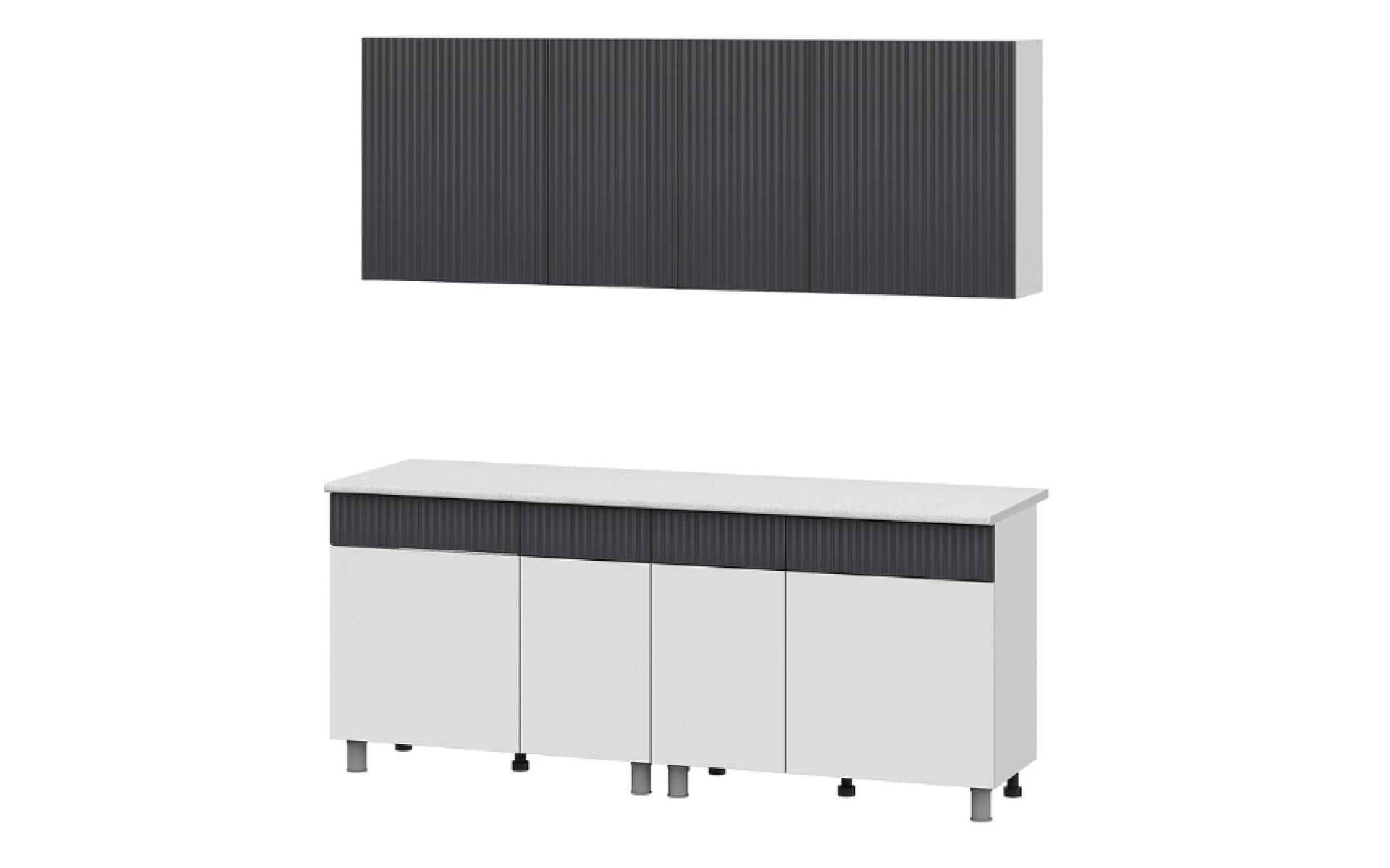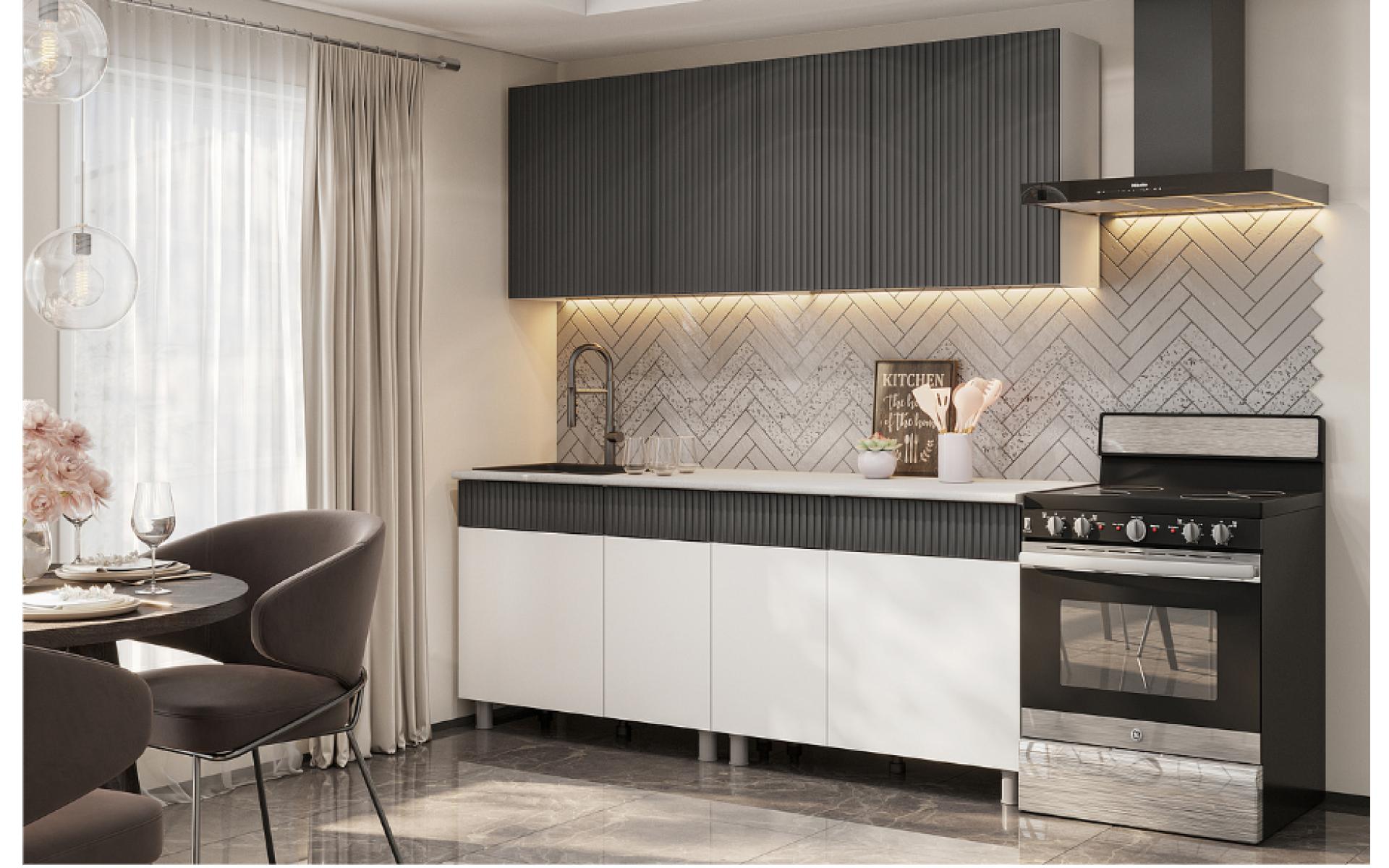 Кухонный гарнитур «София 2м» — это стильное и практичное решение для вашей кухни. Корпус выполнен из ЛДСП белого цвета, что придаёт гарнитуру лёгкость и свежесть. Фасады из МДФ в цвете «Бланж» с графитовым матовым акцентом добавляют изысканности и глубины.