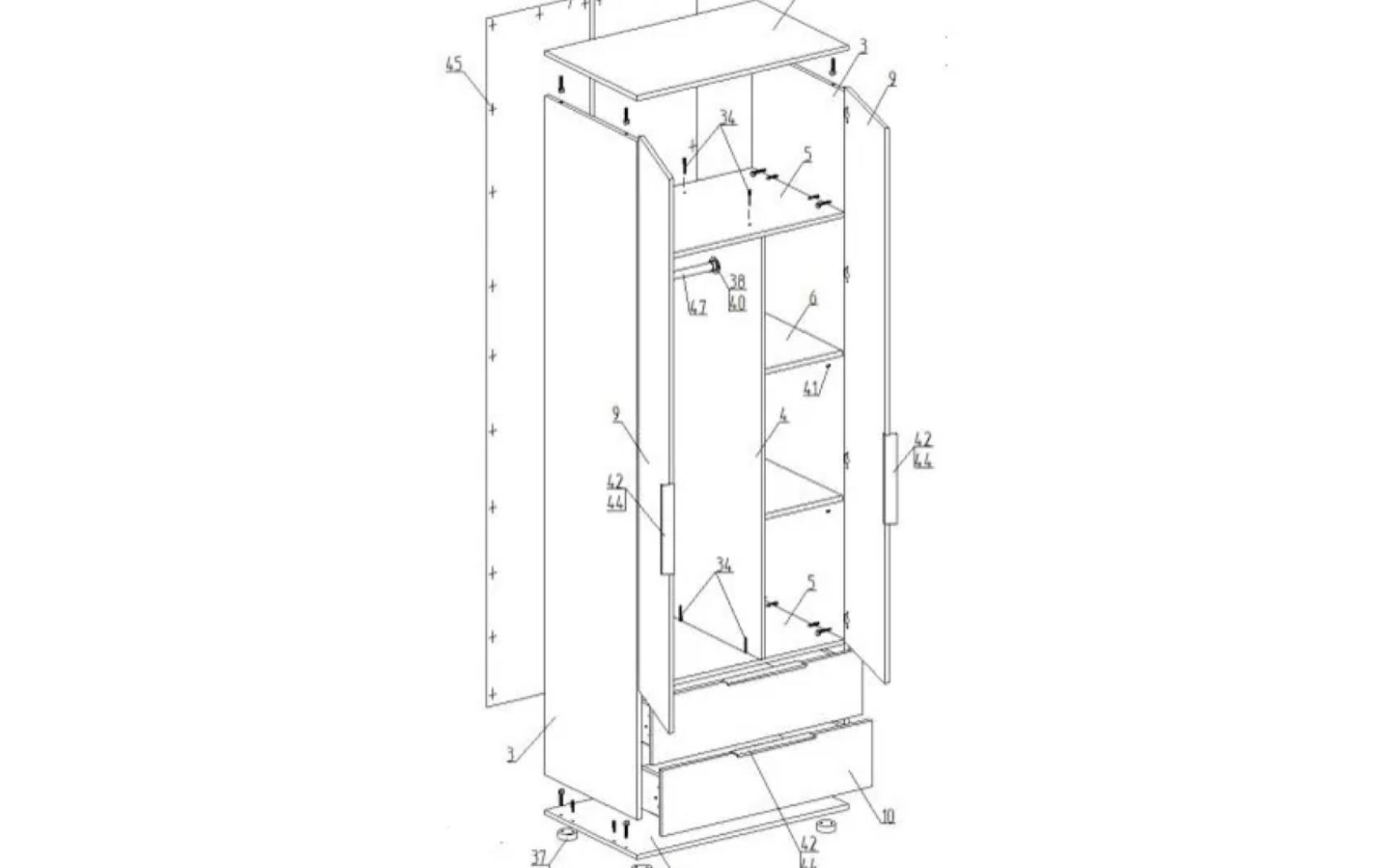 Шкаф с двумя створками, отделения поделены на отсек с полками и отсек с штангой, а так же имеет 2 выдвижных ящика.