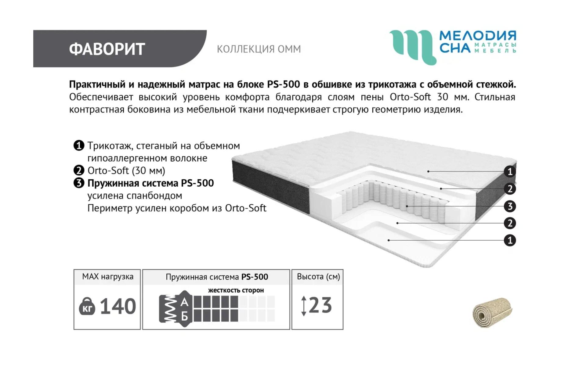 Практичный и надежный матрас на блоке PS-500 в обшивке из трикотажа с объемной стежкой.